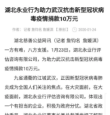 1月23日,腊月二十九日。凌晨两点,一条前所未有的通告,让潘世炳一夜未眠。“从23日10时起,暂时关闭室内公共交通以及航空和铁路的离汉通道。”这条信息让潘世炳意识到,这场没有硝烟的“战争”正在全面升级。天一亮,他便召集永业行高管召开视频会议,亲自担任疫情防控工作领导小组组长,围绕抗疫捐助、疫情防控、员工健康监测、信息排摸、工资发放及困难员工救助等进行专题研究。23日下午4时,永业行捐赠的10万元新冠肺炎疫情防控专款转入武汉市青少年发展基金会账户,成为疫情发生后国内首家捐赠的专业服务机构,多家媒体宣传报道。