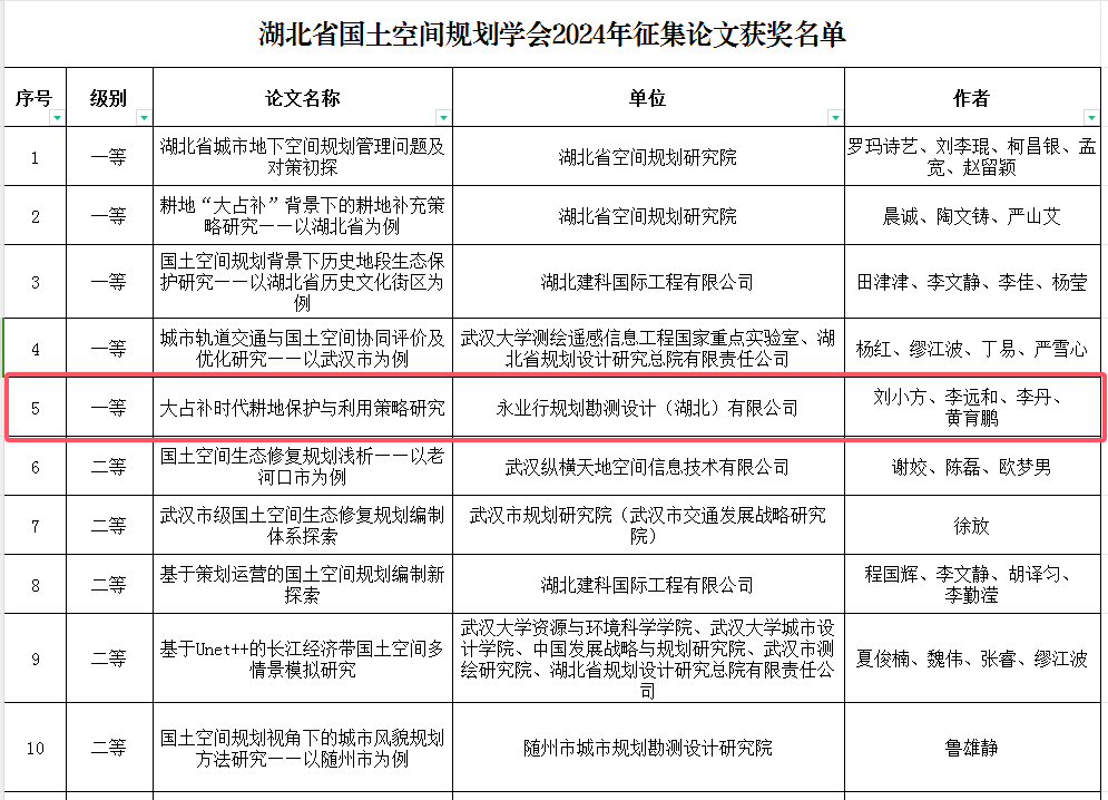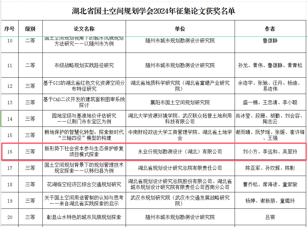 2024年11月20日,2024年国土空间规划论文征集活动获奖名单公布,永业行共有2篇论文获奖,其中一等奖1篇,三等奖1篇。
